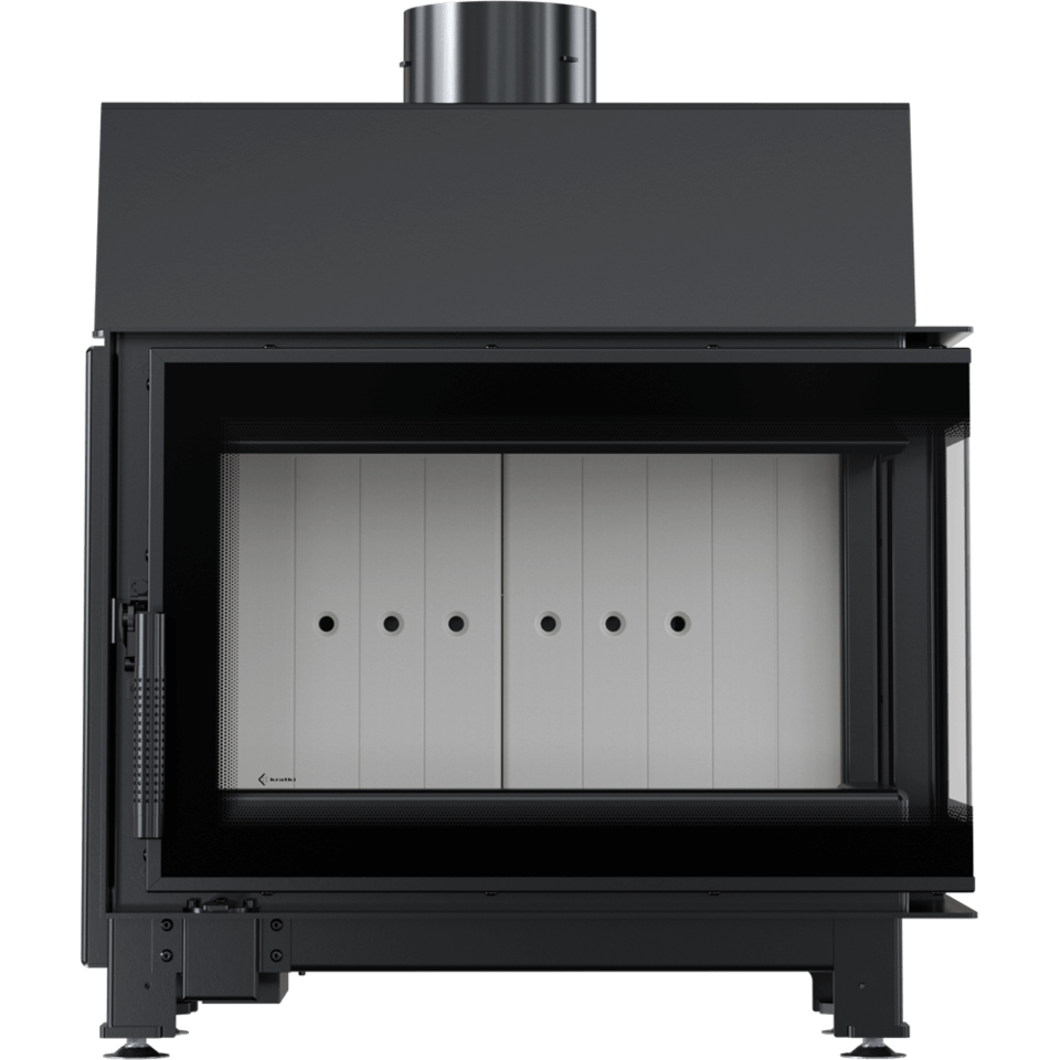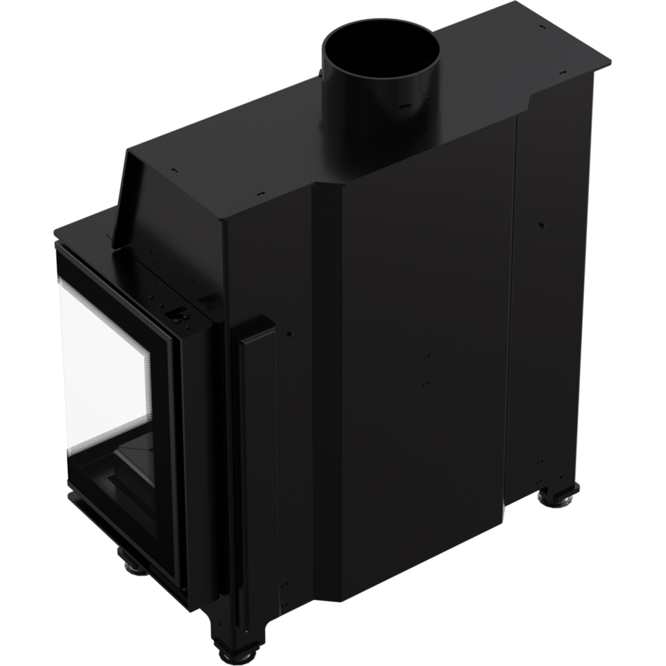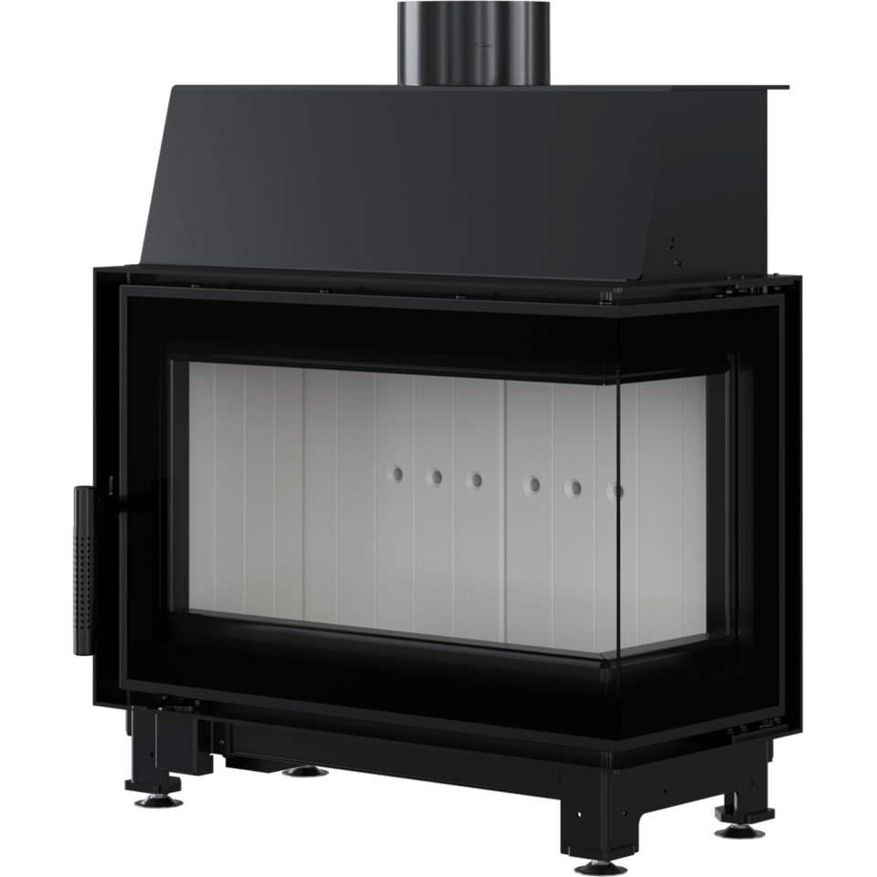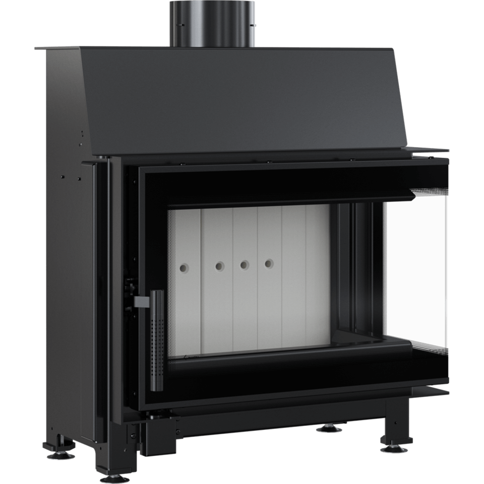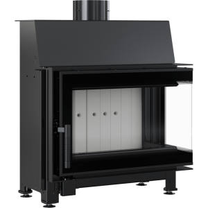 Wkład kominkowy z dwoma szybami zestawionymi ze sobą pod kątem prostym (szyby łączone bez szprosa). Dekoracyjna szyba typu glass wytrzymująca temperaturę do 660°C, która nadaje kominkowi nowoczesny i elegancki wygląd, optycznie powiększa front wkładu.