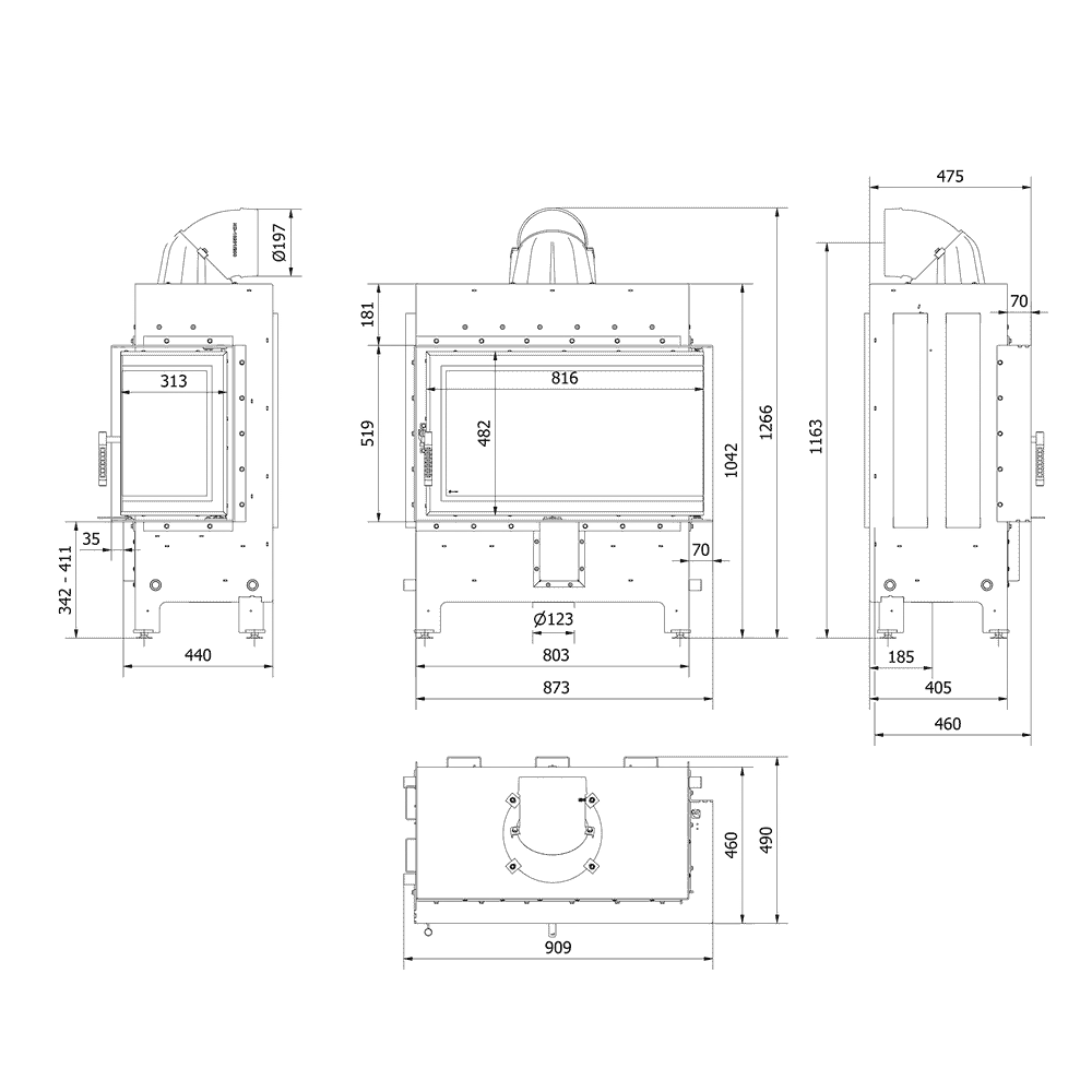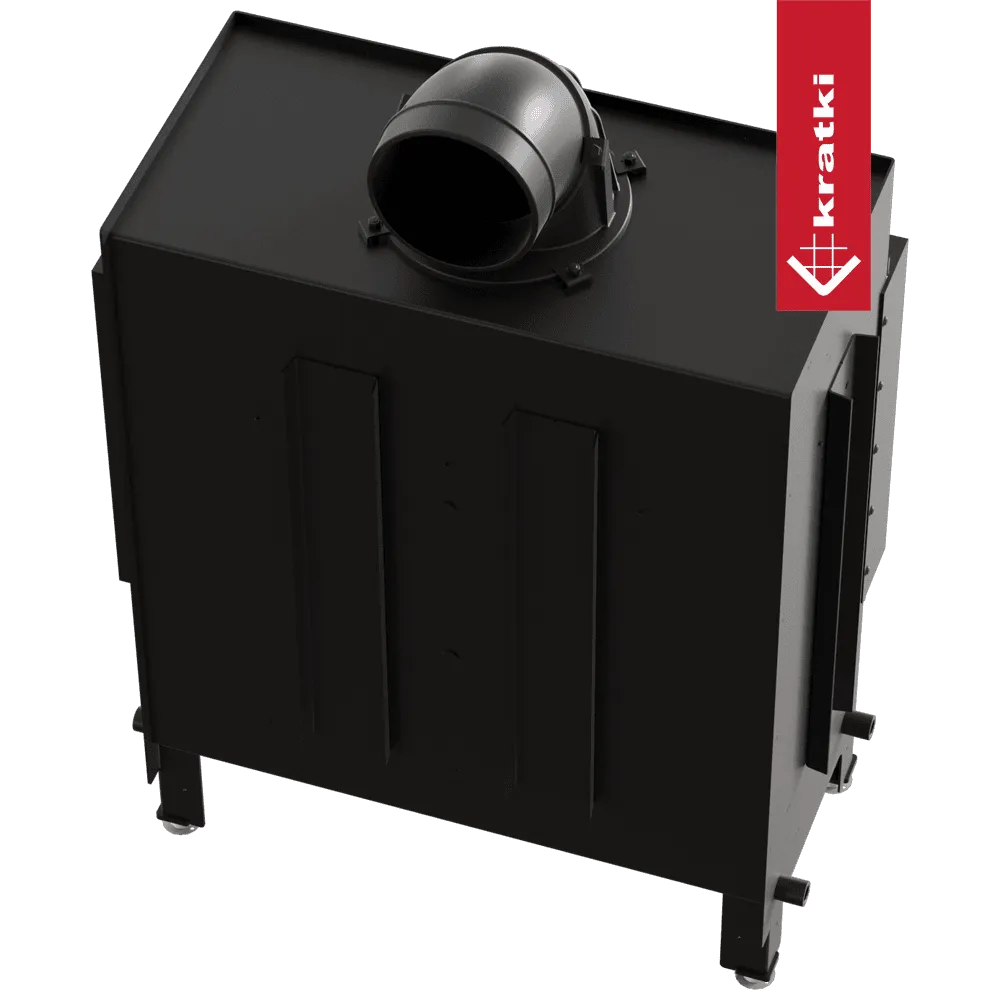 Dodatkowo we wkładzie zastosowany jest system czystej szyby (kurtyna powietrza), czyli powietrze dostarczane jest bezpośrednio na szybę poprzez system kanałów umieszczonych na bokach kominka. W ten sposób dostarczany jest tlen do górnej części komory spalania, w której następuje dopalanie gazów powstałych w procesie spalania drewna, co dodatkowo ogranicza emisję szkodliwego CO do atmosfery.