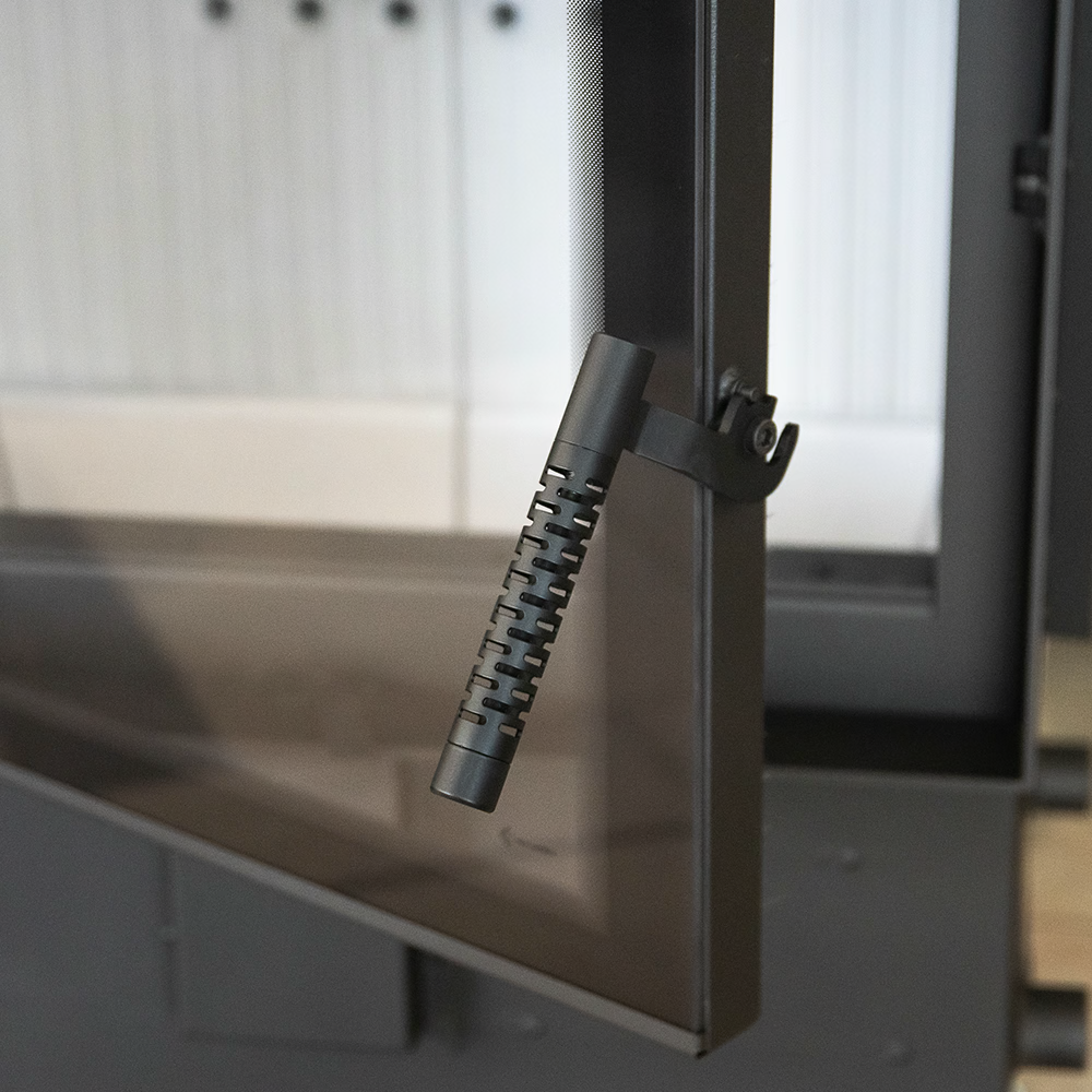 Wkład wyposażony jest w pojedynczą, dekoracyjną szybę typu glass, dzięki której wygląda elegancko i nowocześnie. Zastosowanie tego rozwiązania optycznie powiększa front wkładu i podkreśla wizję ognia. Drzwi wkładu posiadają wygodną klamkę.
